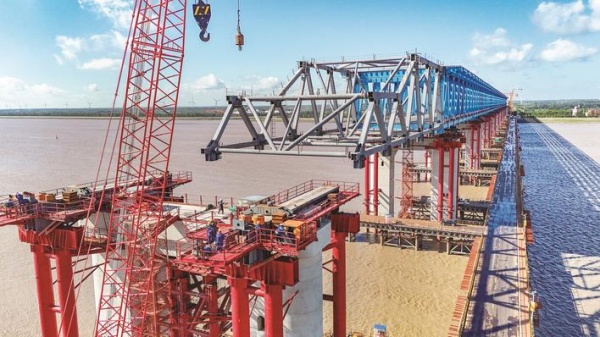 崇启公铁长江大桥建设全力推进 钢梁顶推突破千...